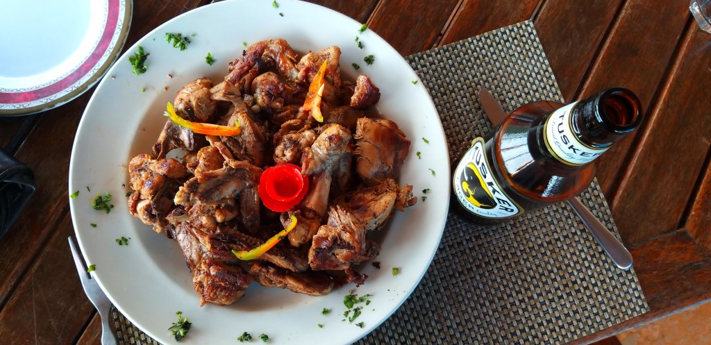The food looked delightful, but looks can be deceiving and in this case it was. The kuku choma I was served was, dreary, uninteresting, dull and every other synonym of bland you can think of, with a little hint of garlic here and there to try and save face. Not even the subpar chili sauce I was offered could save it. The cold tusker and the monkeys and baboons playing in close proximity to the restaurant did all they could to try and mitigate the situation but I love food and no amount of distruction could hide the fact that the food was simply not great.
